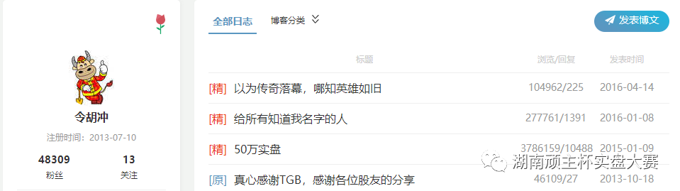 后来和几个炒股的朋友聚会,问他们有没有什么网上交流炒股的地方,于是我知道了论坛这个地方。我刚去那的时候对令胡冲印象最深,他当时有一个50万到800万的实盘贴很火,我朋友说现在也就这个贴子有点营养,我当时对这人真是惊若天人,原来我只是想着靠炒股赚点零花钱,完全没想着炒股还能发财致富,而令胡冲却靠炒股实现了财富自由。