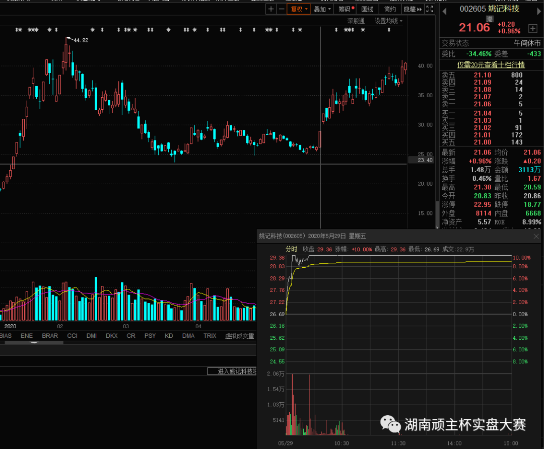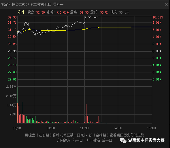 5月29日,主人公全仓打板早盘强势股,也是典型的早盘烂板回封股:姚记科技,不管是从形态,还是题材属性,该股都较前面三支操作标的都更有吸引力,因此他敢于梭哈。