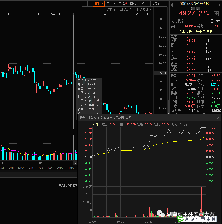 12月30号振华科技,由于是尾盘涨停,2点50分才涨停,之前获利盘较多,且尾盘到55分还放出量来破板,这种不强势的板,第二天有拉升就要出货。第二天高开,一字断魂下跌,应该在9点50分之前出,高开下跌后,第一波反弹没有突破开盘高点时卖出,已经证明不强势了。上方阻力太大,且大盘不是很好。总结:尾盘板2点30分过后的,一定要小心,吃面的很多。