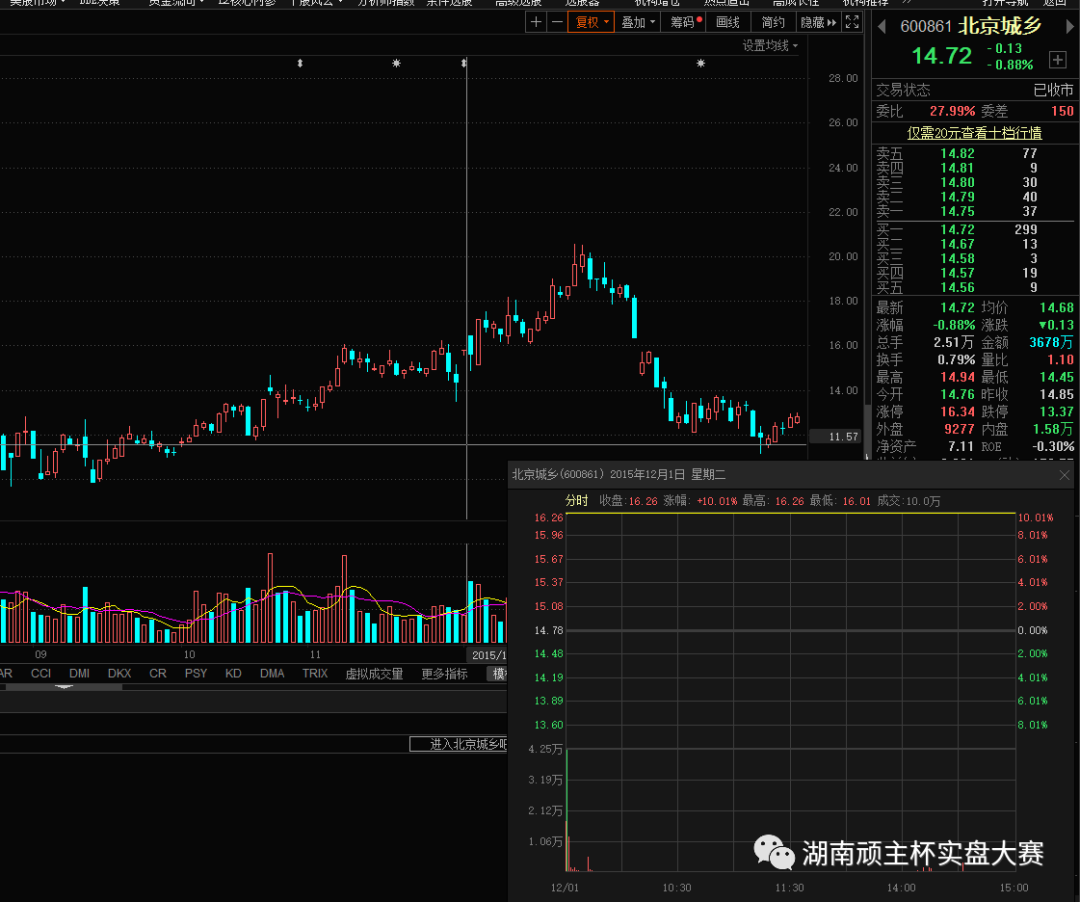 12月1日的北京城乡,举牌利好个股,当天T字板,当天大盘低开,但是北京城乡高开,且利好在昨天已经兑现,昨天大盘是大V,尾盘勉强收红,避免了风险,第二天应该是拉高出货。在第二波拉升明显受阻,第三波反弹高点应该及时获利兑现,均线都已经向下走了,每个人都不可能卖到最高点,越是等,风险会越大,获利不走,导致后面割肉走,得不偿失,获利了的个股,在哪里卖都没有错。从获利到割肉,这才是最得不偿失的。