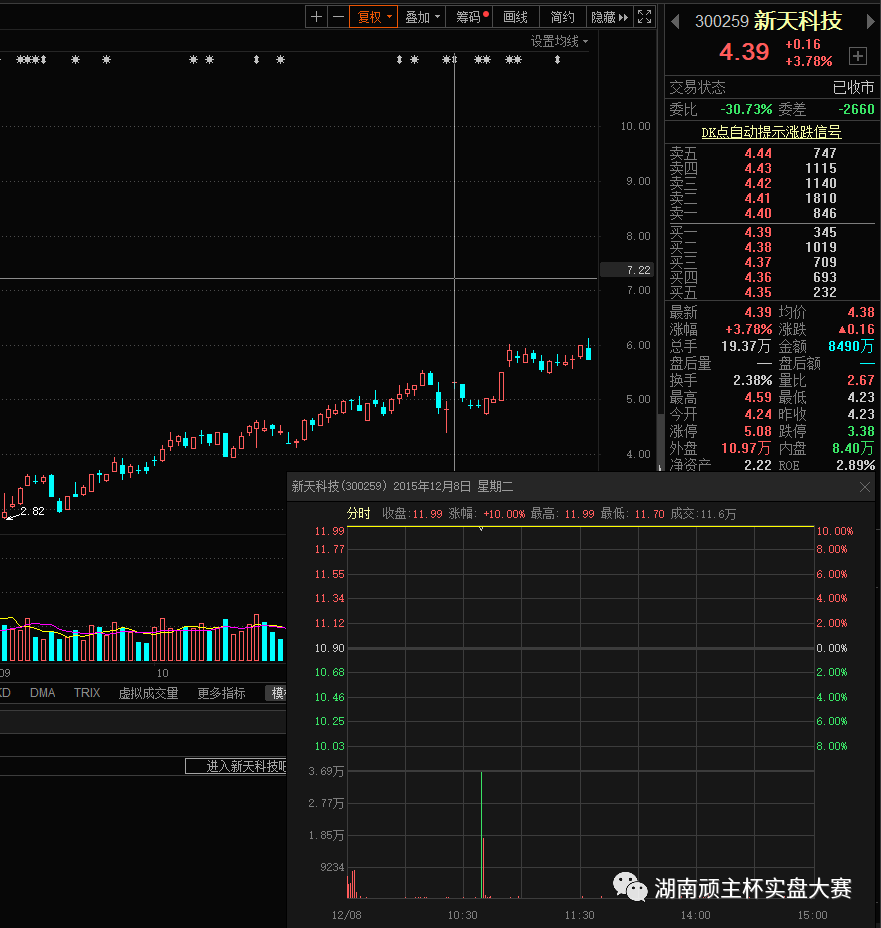 12月8日的消息板,新天科技,T字板,根据当前很多T字板很多第二天直接低开低走。新天科技也开盘就低开,低开近一个点,然后一路下跌,此时有反弹立即卖出。T字板不一定第二天就是高开高走,也要根据市场对T字板的赚钱效应决定,当时很多T字板,第二天直接低开吃面的。T字板没有高开会很危险。应该在第二波反弹没有超过开盘价的时候及时止损,及时止损只会亏最多2个点,而一直到尾盘亏6个点,不仅使亏损风险更大,而且还影响了打板其他个股,得不偿失。以后打板失败第二天,第二波反弹如果没有超过开盘高点,必须止损,不该抱有幻想。一方面是对自己错误操作的惩罚,二是及时止损,是控制回撤最有力的手段。