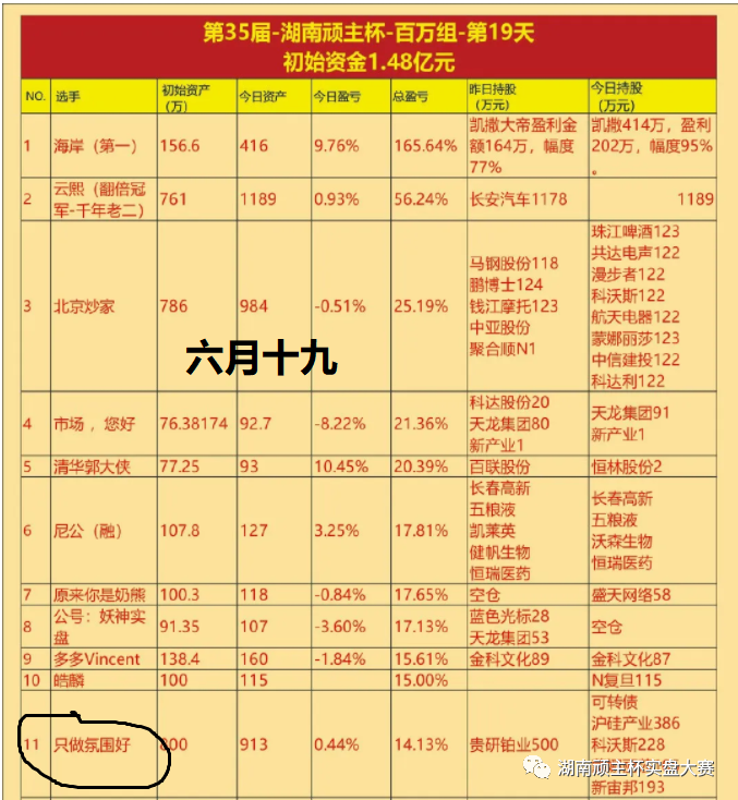只做氛围好,这是比炒家还要大一级的打板高手,他也是主打首板股,但风格不同的是他动不动就是拉出意大利炮来,满仓轰一支个股,本届比赛他也就是轰了几炮,总收益直接达到15%左右,几乎和炒家一样。一个是开超市,一个是全仓梭哈一支股,真可谓首板模式的巅峰对决。