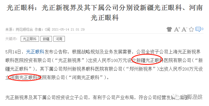 既然说到爱尔,就再多嘴几句小爱尔:光正眼科。全国化的进程正在加速,正式进军新疆和河南: