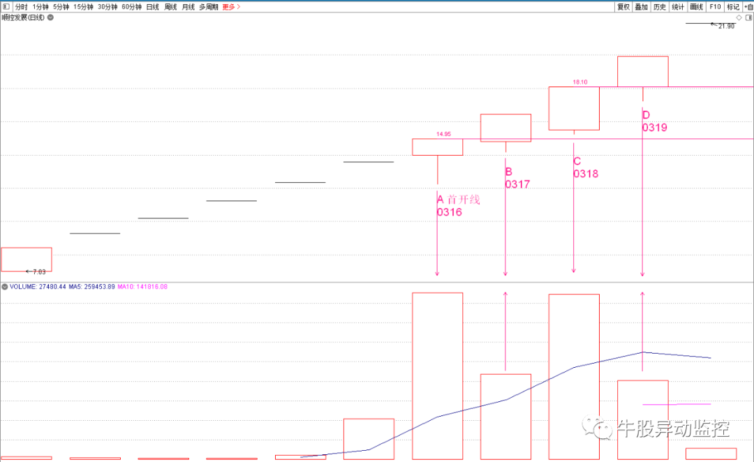 首先,“站稳首开,红包自来”。该股在0316放量开板之后,形成了一条首开线A线;而后B柱低开回踩首开线缩量涨停,C柱在0318这天早盘在首开线14.95之上开盘后快速拉升,表明首开已经守住,按照苏老师的次新战法,守住首开,红包必来,直觉告诉我这个票可能有戏。