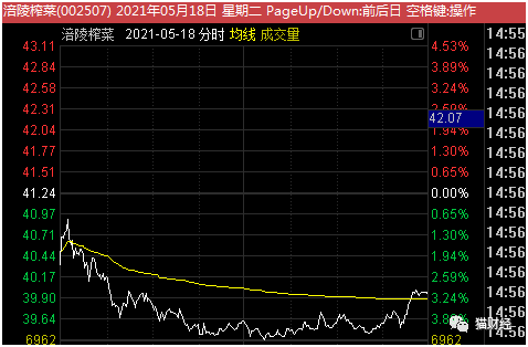 历时九个月,涪陵榨菜以33.58元/股的发行价完成总金额33亿元的定向增发,有包括易方达、景林资产、高盛在内的20家机构哄抢,作为定增方案落地后首个交易日,涪陵榨菜上午盘中涨停,不过截至收盘,涪陵榨菜涨幅回落至5.2%。报价41.24元。