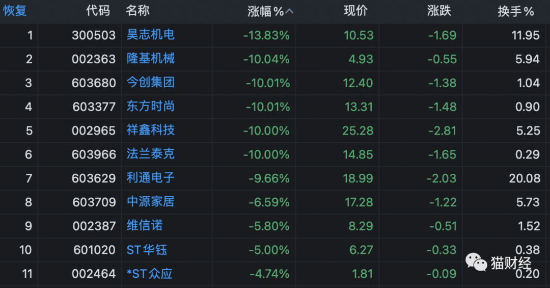 其中创业板的昊志机电跌幅达到13.83%,盘中曾一度触及跌停,此外隆基机械、今创集团、东方时尚等6只股票全部跌停,中源家居、维诺信跌幅也分别达到6.59%、5.8%,而被叶飞暂时踢出名单的利通电子由于被证监会立案调查也同样跌停。