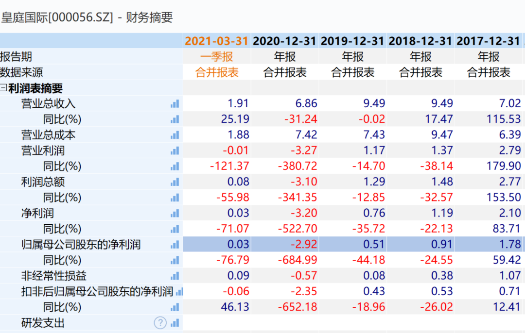 皇庭国际2020年年度报告显示,报告期内,实现营收6.86亿元,同比上一年下滑31.24%;归属于上市公司股东的净利润为-2.92亿元,同比上一年下滑684.99%;归属于上市公司股东的扣除非经常性损益的净利润-2.35亿元,同比上一年下滑652.18%。