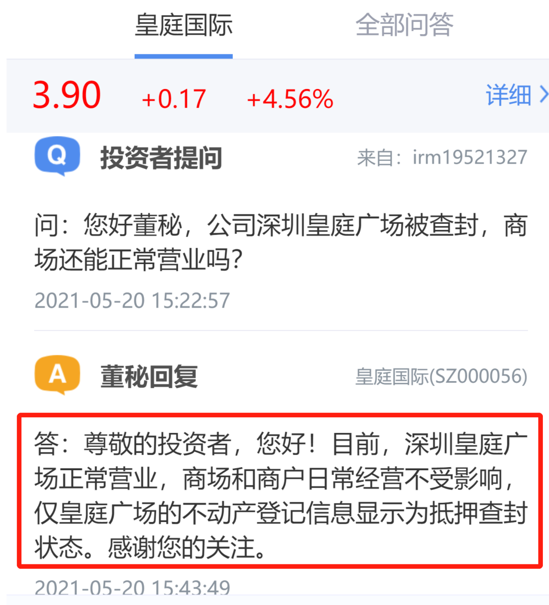 对此,皇庭国际(000056)5月20日在互动平台澄清称,目前,深圳皇庭广场正常营业,商场和商户日常经营不受影响,仅皇庭广场的不动产登记信息显示为抵押查封状态。