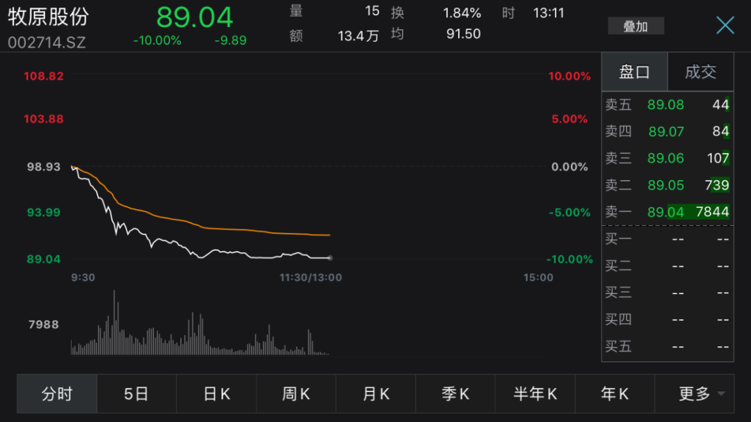 不过,由于生猪价格持续下跌,相关个股股价下跌,新希望、龙大肉食、华统股份跌幅较大,跌超3%。而市值超过3000亿元,有“猪茅”之称的牧原股份上午一度跌停,最终截至午间休盘跌9.67%,市值蒸发约360亿元,而下午开盘后,牧原股份再次跌停。