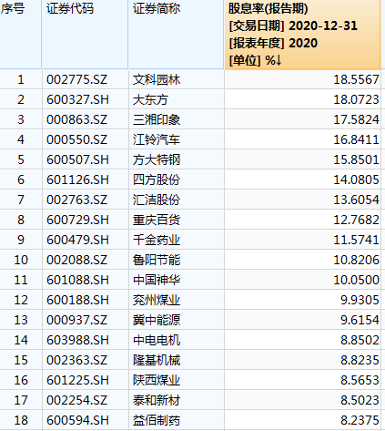 从2020年度分红率、股息率可以发现,很多个股的两个指标关系密切,分红率居前的江铃汽车、四方股份、重庆百货、汇洁股份、文科园林等股,其股息率同样居前。一方面是由于这些公司将要分红的现金量足够多,另一方面也表明公司的股价与业绩关联紧密,市场波动影响比较小,属于基本面驱动型个股。