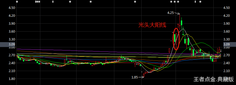 (1)光头大阳线 – 当日以最高价收盘,收盘价大幅高于开盘价,出现长的红色实体,图形同时具有下影线,表明当日曾经出现过探底回升的走势。大阳线实体部分涨幅一般在3%到5%。**************