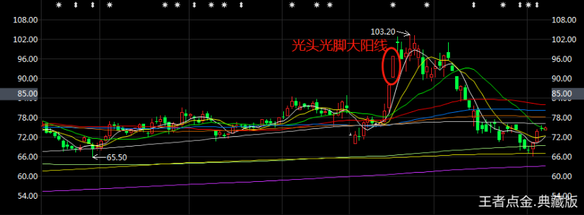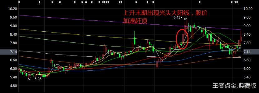 大阳线在K线上表示为收盘价以最高价或接近最高价的价格报收,而最低价则与开盘价相同或接近,大阳线的出现说明了股价出现了大幅度的上涨。如果大阳线出现在股价启动阶段则表明资金开始涌入,市场多方力量开始增强。此时买方力量强劲,投资者可以择机买入,一般在短线的波段操作中都会获得相对较好的收益。**************