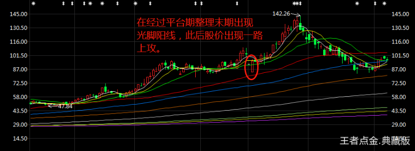 (2)光脚大阳线 – 表明当天股价以最低价开盘,收盘价相对于开盘价出现大幅上涨K线带有上影线,上影线的最高点为最高价,说明当日有冲高后小幅回落的现象。一般大阳线实体部分会出现3%到5%左右的涨幅。