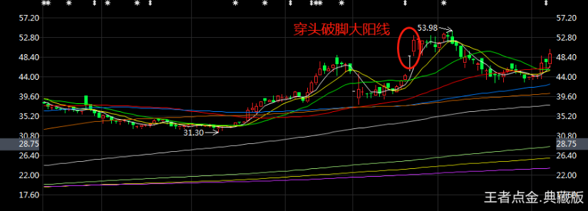 (3)穿头破脚大阳线 – 当天出现过的最高价与最低价与开盘价和收盘价不同,说明当天出现过的振幅要大于开盘价到收盘价的涨幅,说明股价在运作过程中出现过一定的反复,但最终还是选择向上。实体部分的涨幅一般在3%到5%之间。