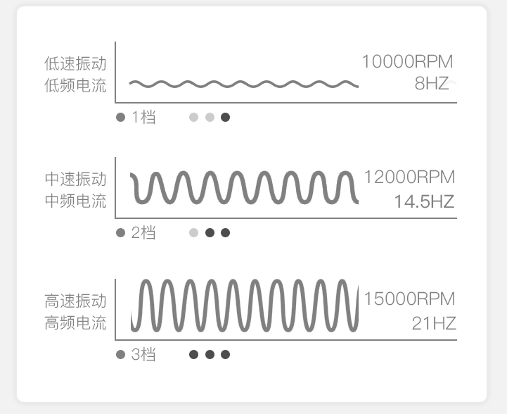 设有3档不同的振幅电流力度,每个人的敏感度不同,所需要的力度和振幅也有所差异。