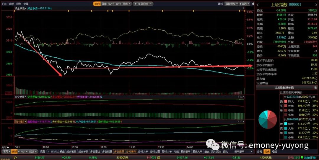 隔夜美股科技概念大涨,对A股影响却有限。早盘仅是小幅高开,在证券、保险双双回落之下,沪指就进入了下降通道,直接跌破3500点整数关,也击破昨日低点,于3480点附近才有所止跌。午后周期类个股尝试反攻,最终依旧无果,无力推动市场做多人气聚集。从赚钱效应上来看,上涨下跌家数基本持平,下跌只比上涨多出39家。最终沪指报收于3486.56点,下跌20.39点,成交金额3560亿元,资金净流出152亿元。