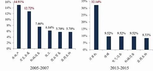 2013-2015年,处于智能制造时代,龙头股集中在计算机、电气设备领域。计算机行业占比高达32.14%;