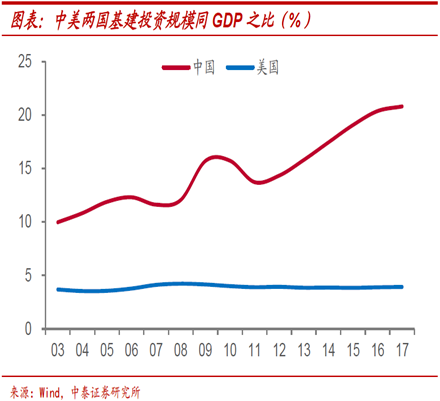 以基建投资为例, 美国基建占GDP比重很稳定,自2003年以来一直稳定在4%左右 ,而与之形成鲜明对比的是,我国基建投资规模占GDP的比重从2003年的不足10%,到2017年已经提高到超过20%。