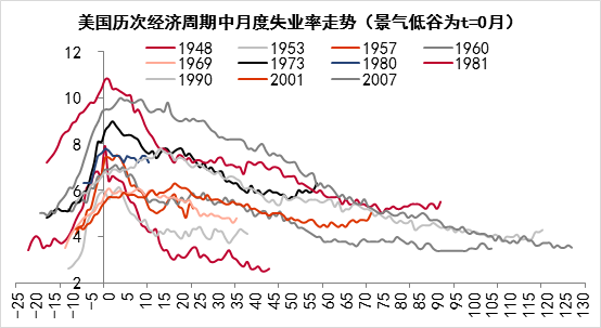 美联储会很快缩表吗? 市场有观点认为下半年美联储会削减QE规模,甚至明年可能会加息,理由是通胀压力和经济复苏力度。回顾历史不难发现,美国经济一旦陷入衰退期后,复苏会越来越慢,在经济恢复增长的同时,就业的恢复更慢。尤其在1990年以后,每一次衰退后,就业恢复到衰退前的水平所需要的时间越来越长,如2008年危机后,美国GDP的恢复只用了14个季度,而恢复就业则用了7年时间,到2014年7月才彻底恢复至衰退前的水平,一直到2014年10月耶伦才宣布结束QE。 美国每轮经济周期中失业率走势(%)来源:CEIC, 中泰证券研究所