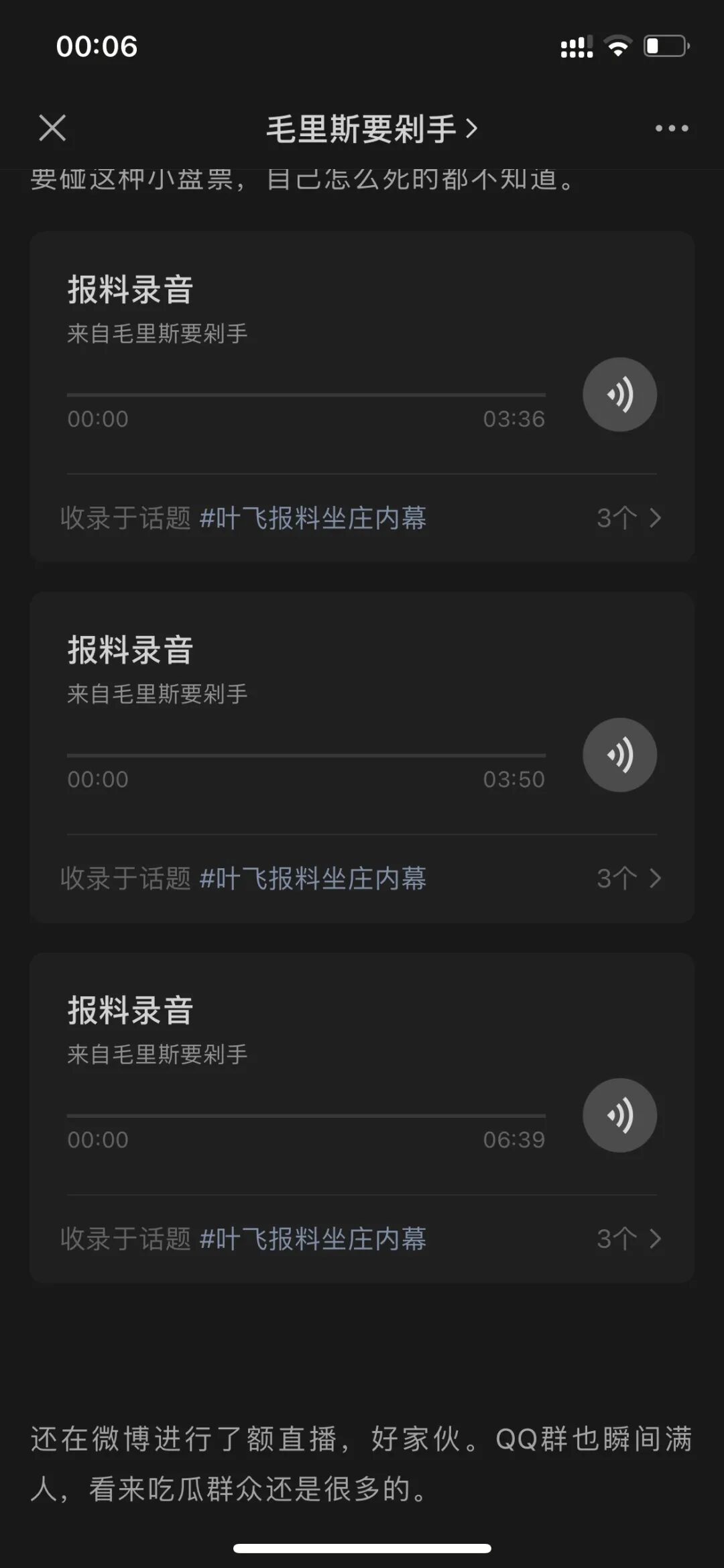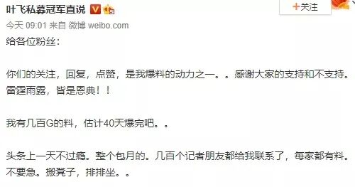 叶飞表示,他有几百G的料,估计40天爆完,准备爆料18家公司,“看了一下材料,计划爆料18家上市公司,只多不少!”