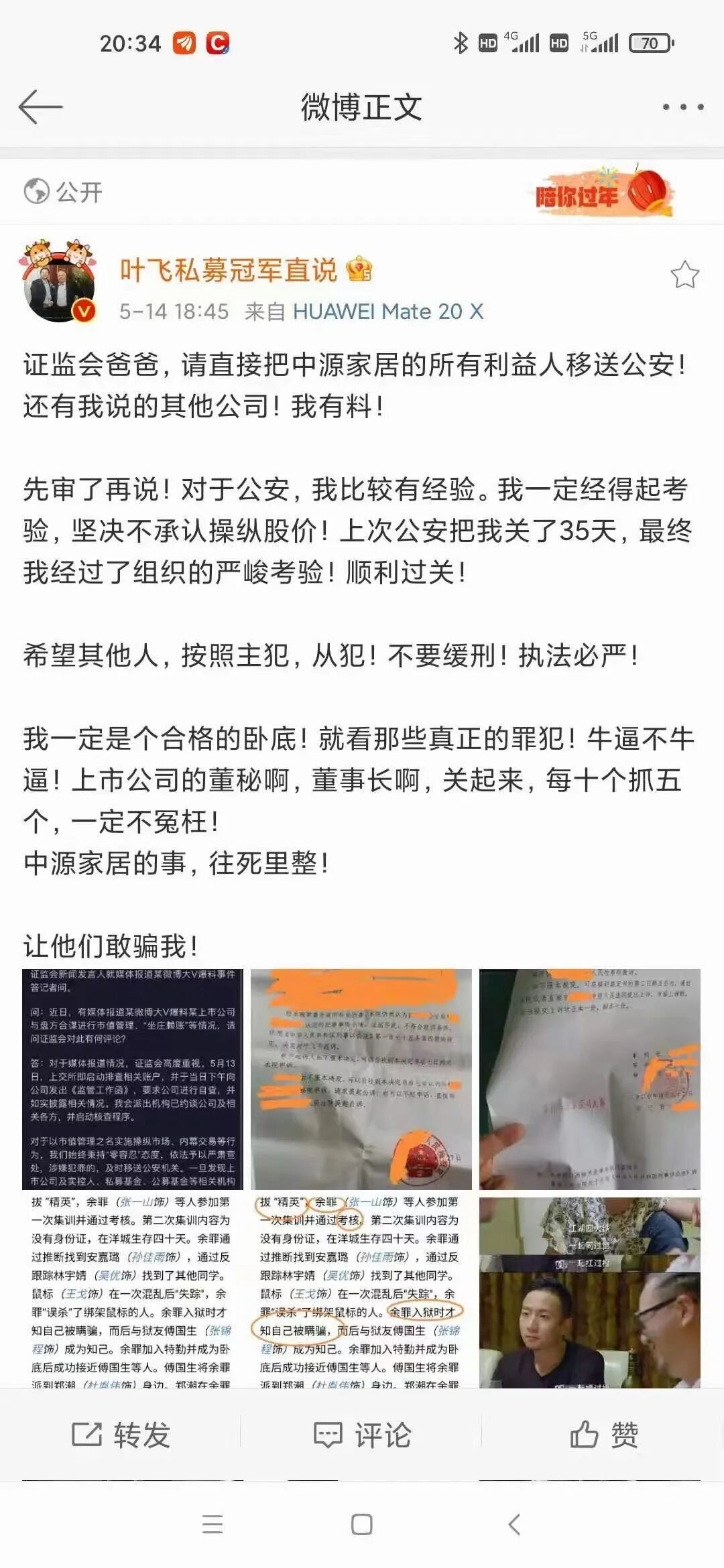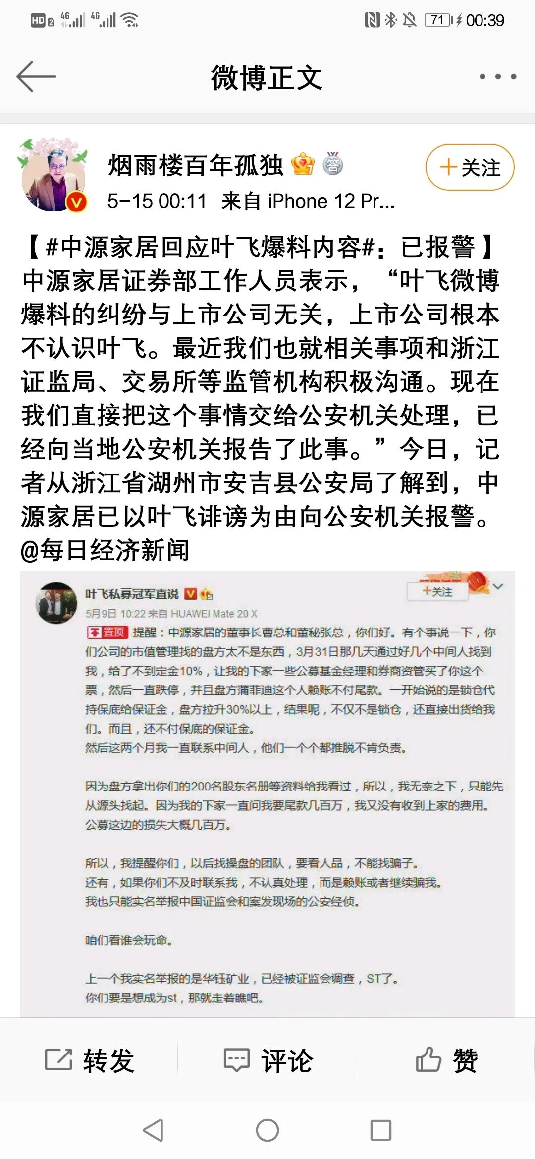 微博大V叶飞继举报中源家居之后,似乎意犹未尽,今天又点名了多家上市公司。
