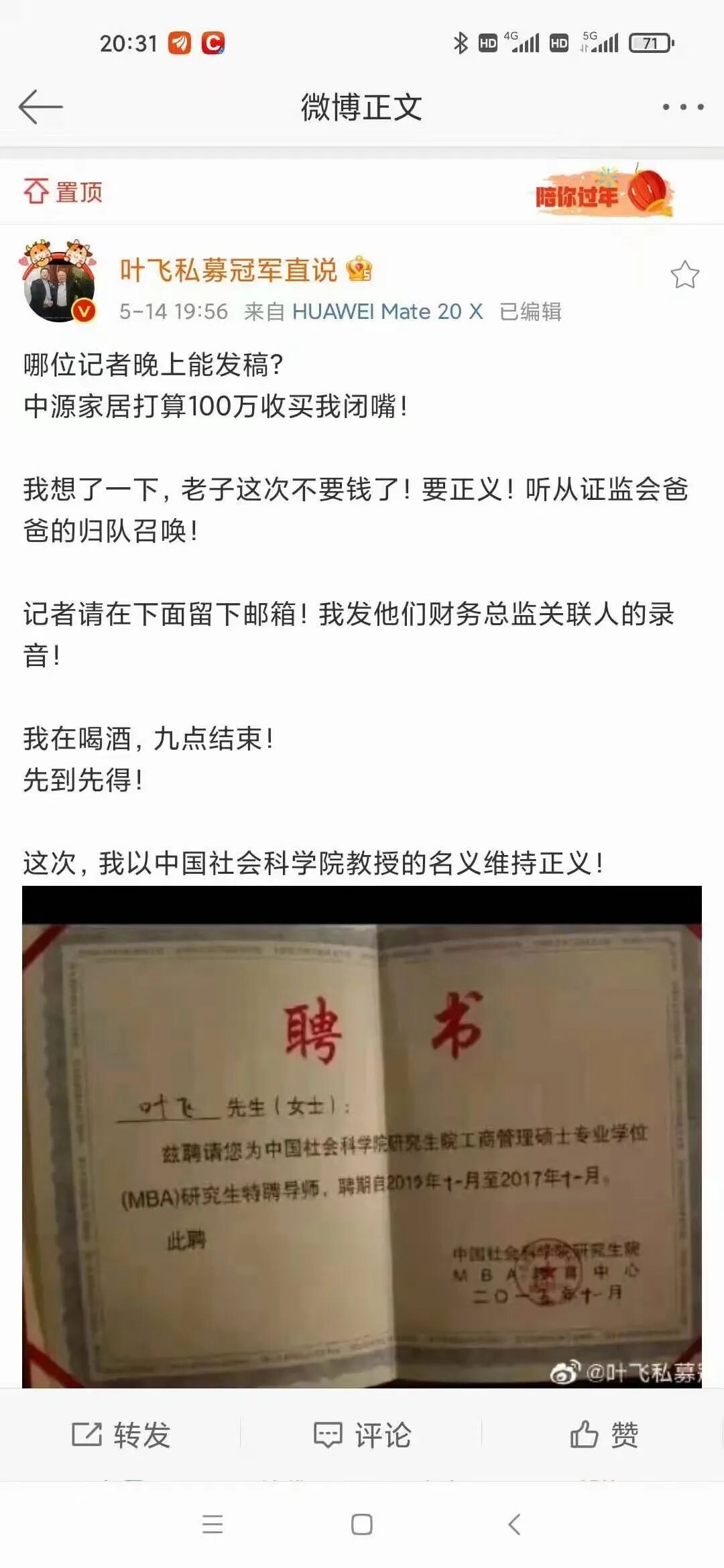 在爆料中源家居的微博中,叶飞称:“你们公司的市值管理找的盘方太不是东西,3月31日那几天通过好几个中间人找到我,给了不到定金10%,让我的下家一些公募基金经理和券商资买了你这个票,然后一直跌停,并且盘方赖账不付尾款。”