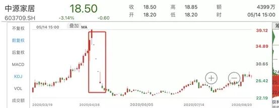 有意思的是,同时段开启暴跌的还有叶飞第一个点出的中源家居,该股从2020年4月1日到4月29日股价大涨56.68%,4月29日股价创出了39.5元/股的年内新高,也是从4月30日开始突然开启暴跌模式,连收三个一字跌停,手法近乎一样。