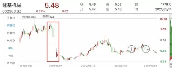 隆基机械去年上半年曾有过一波大涨,从2月初的4.52元/股一度上涨至4月8日的10.36元/股,最高涨幅达129%。但自4月30日开始突然开启暴跌模式,连收三个跌停,股价几乎腰斩。图片