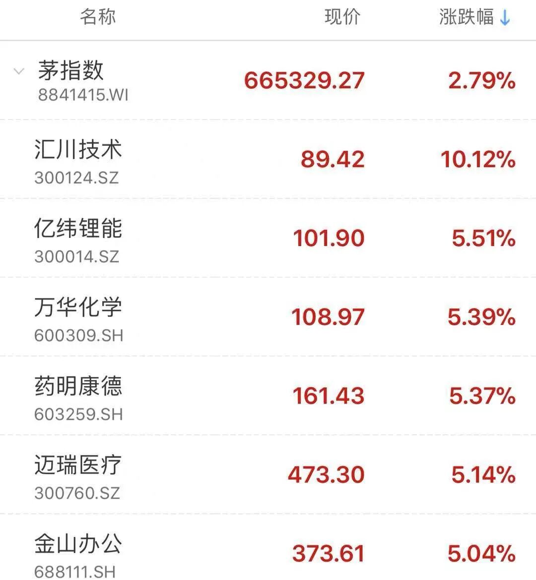 茅指数上涨2.79%,其中汇川技术大涨10.12%,亿纬锂能、万华化学、药明康德、迈瑞医疗等涨幅超5%。