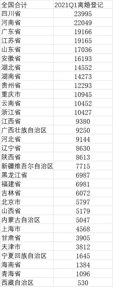 导读 :2021年一季度,离婚登记人数更是大幅下跌超过七成以上,仅有29.6万对。从各省份数据来看,一季度四川、河南和广东离婚人数位居前三。