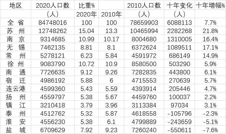 其中,苏州十年增长228.8万人,总量达到了1274.8万人,十年增幅达到了21.8%,是全省7.7%增速的近三倍。苏州人口占全省的比重,从13%提升到15.04%,提升幅度位居全省第一。作为一个普通地级市,在江苏整体出生率较低、老龄化程度较深的情况下,苏州的增幅和增速可谓十分突出。