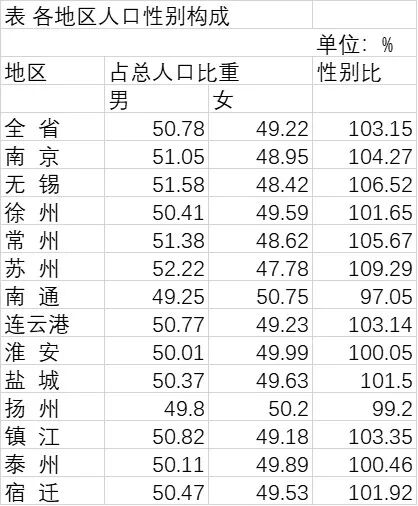 此外,在性别比方面,江苏全省由第六次全国人口普查的101.52上升为103.15。13个设区市中,总人口性别比在100以下的市有2个,在100至103之间的市有5个,在103至107之间的设区市有5个,在107以上的设区市有1个。