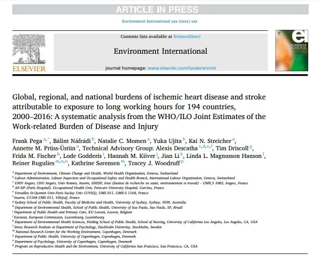 这份报告发表在多学科开源期刊《环境国际》(Environment International)上。该报告对长时间工作导致的生命和健康损失首次进行了全球分析。