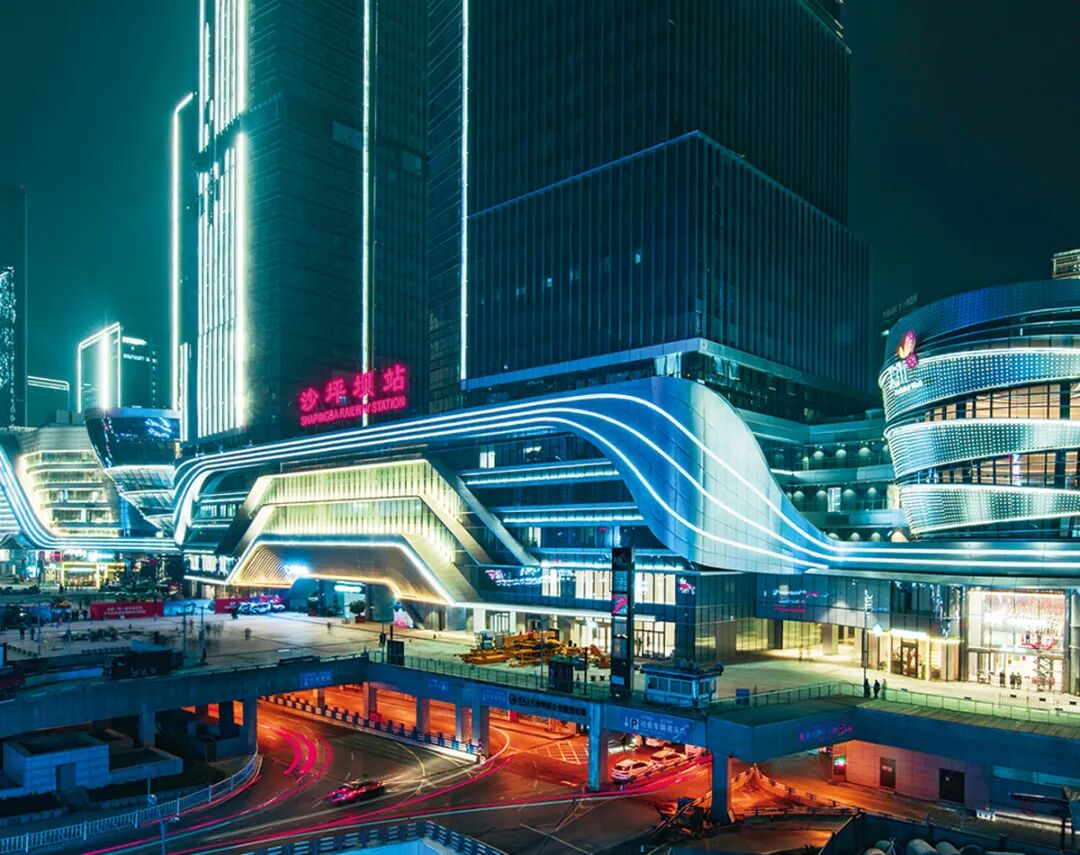 重庆沙坪坝高铁站上盖综合体“龙湖光年”,涵盖写字楼、酒店、购物中心,以及成渝高铁,3条地铁和30多条公交线路接驳。