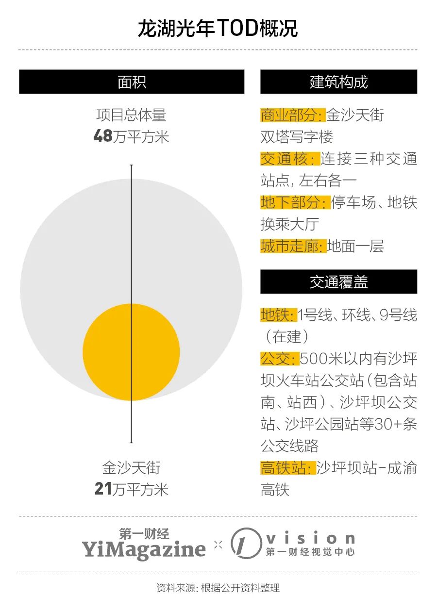以金沙天街的裙楼商业和其所在的双塔写字楼为主体,龙湖将这个TOD综合体命名为龙湖光年,并加入了酒店、公寓、多种公共交通接驳通道,总面积达48万平方米。