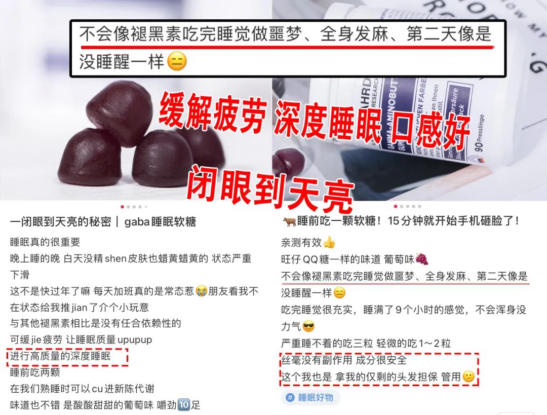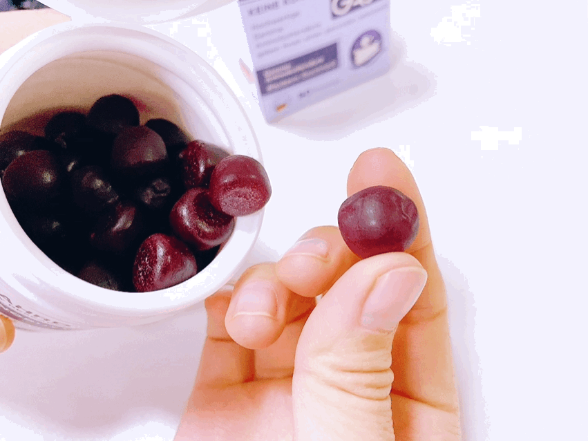①【口感好】 本来以为就是保健类软糖,看着也很 像葡萄味qq糖, 吃起来酸酸甜甜的。 两颗下肚,不到20分钟就困到不行,眼皮都睁不开的那种。