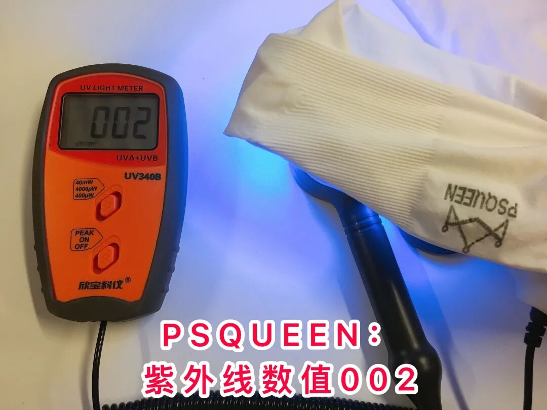 而隔着 PSQUEEN防晒冰袖 ,经紫外线灯照射后, 是完全看不见防伪码的, 这结果不竖个大拇哥都说不过去!👍