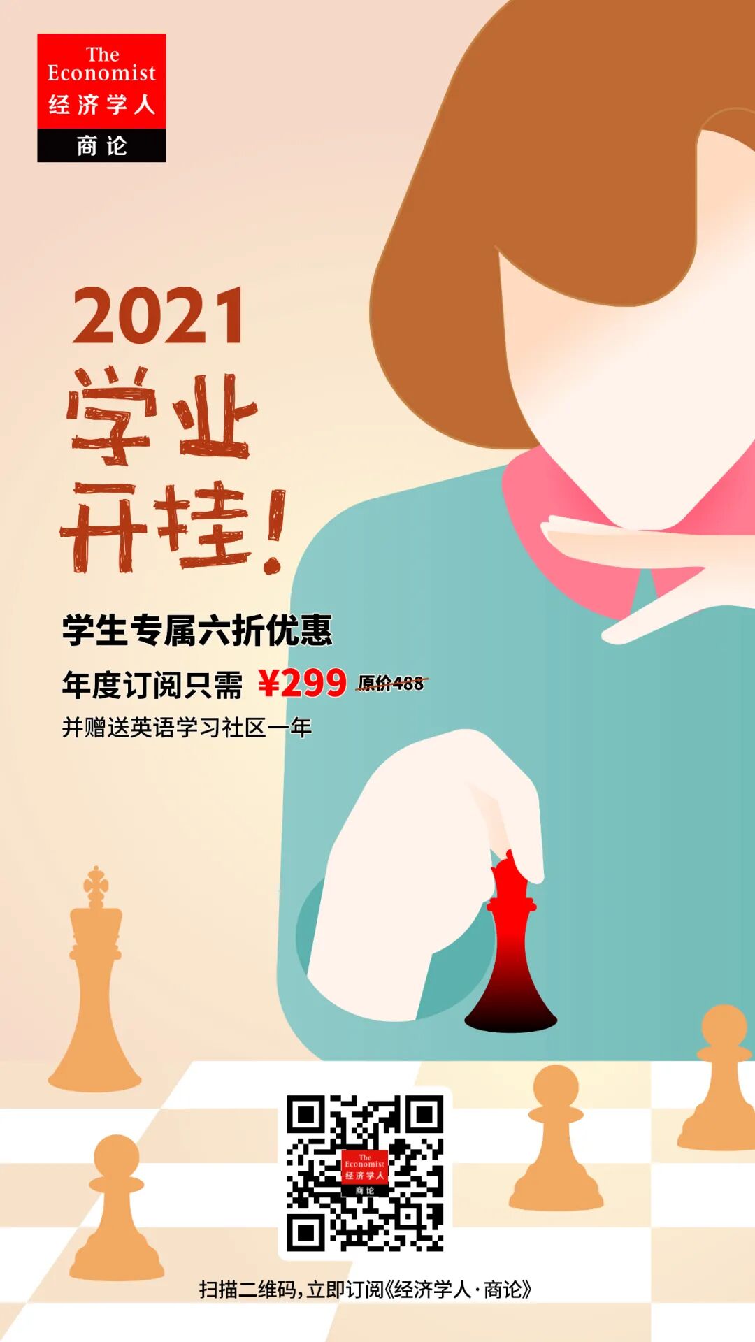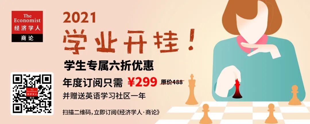 【学生订阅特惠持续进行中】 长按识别下方海报中的专属二维码, 即可以 299元 的优惠价订阅全年《经济学人·商论》。每天仅需0.81元,就能全年不间断阅读最新《经济学人》原文+官方中译版本,并 免费加入 官方译者主理的商论英语学习社区
