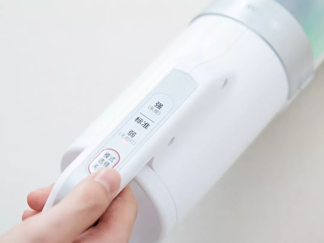 按键设计在手柄处,在除螨吸尘的过程中,可以随时切换。
