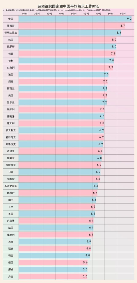 根据OECD的数据显示,我国是全世界最勤劳的民族,平均每天工作时长高达9.2个小时,排名全球第一。
