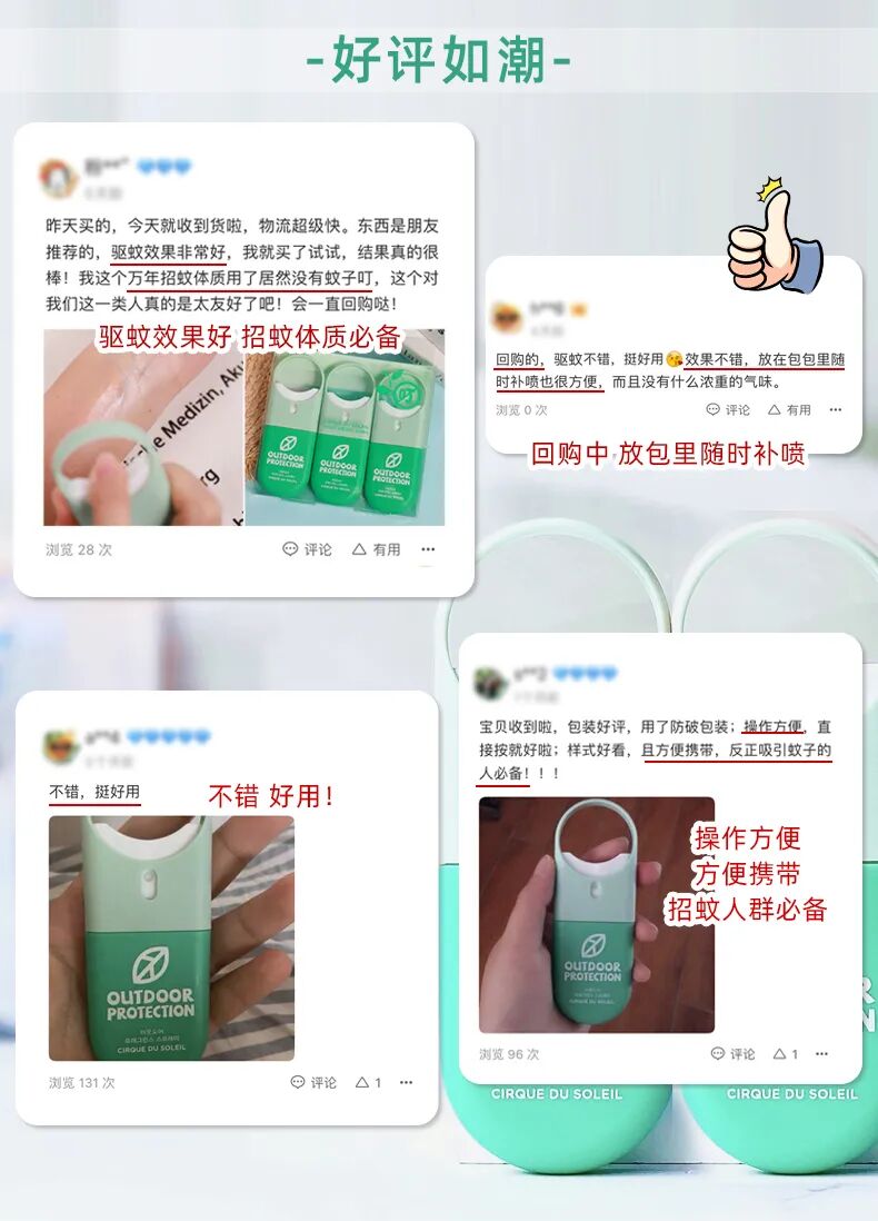 喷一喷, 可实现4-6小时的长效驱蚊 ,就像随身的“隐形蚊帐”一样,让蚊子不敢近身!