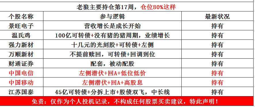 A股之前没有参与核心资产,回调的时候也没有参与,现在也不会考虑参与。本周A股基本佛系陪跑,持仓券商回血,但离目标还有50%,不急,回调再考虑上仓位做波段;主要操作在港股通,中车时代几乎全部压去中国电信。资金有限情况下,今年更加考验持仓耐心,考验选股能力。