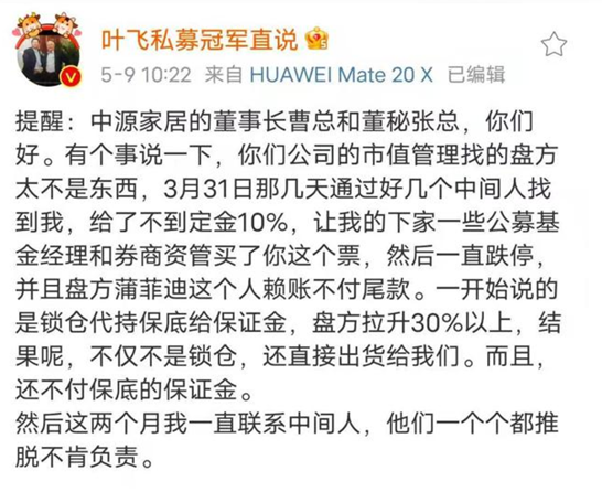 “对方付了不到定金的10%,一开始说锁仓代持保底给保证金,盘方拉升30%以上。结果,不仅不是锁仓,还直接出货给我们,还不付保证金。”叶飞通过微博公开炮轰中源家居和盘方“坐庄赖账”,并透露自己拉来公募基金经理和券商资管,却成了接盘侠。