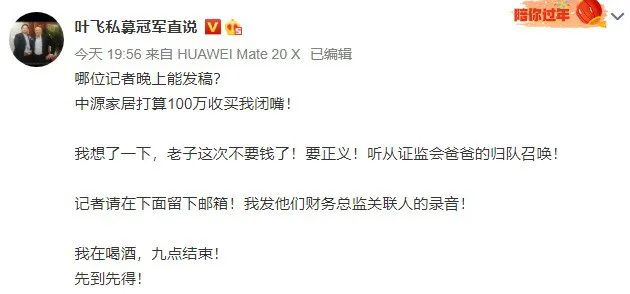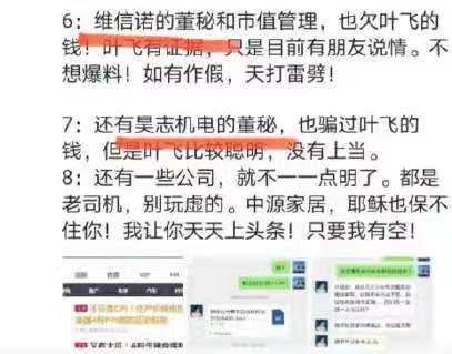 更令市场“炸锅”的是,叶飞晚间又在微博上宣称,“中源家居打算100万收买我闭嘴!”
