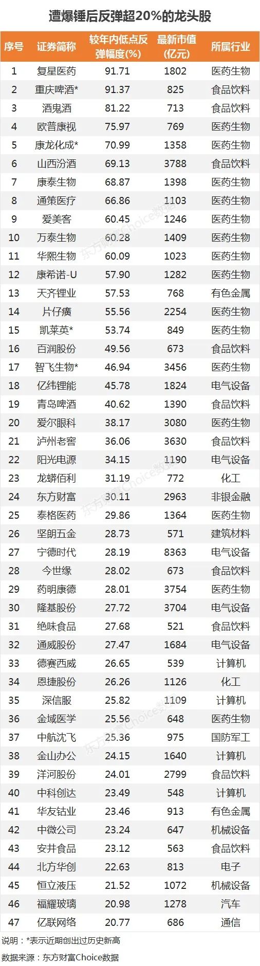 复星医药和重庆啤酒是反弹最猛的两只龙头股,反弹幅度分别为91.71%和91.37%。此外,酒鬼酒、欧普康视、康龙化成、山西汾酒、康泰生物、通策医疗、爱美客、万泰生物和华熙生物等龙头股也较年内低点反弹超过60%;康希诺-U、天齐锂业、片仔癀、凯莱英则反弹超过50%。