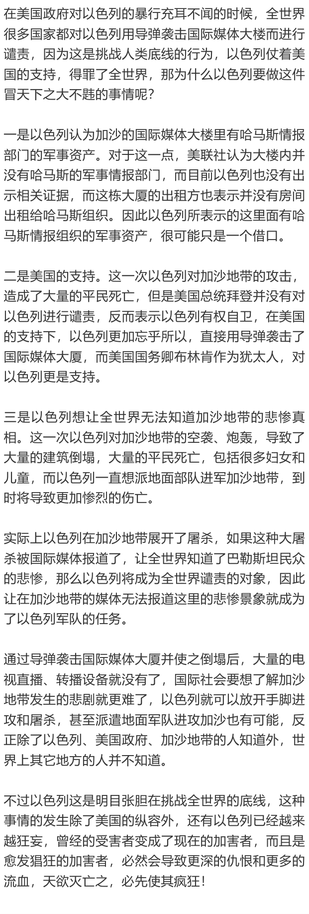 今天,全世界都被一则消息震惊了,那就是以色列向加沙地带的美联社、卡塔尔半岛电视台等国际媒体所在的媒体大厦发动了袭击,用三枚导弹击垮了这座媒体大楼,引发了全世界的愤怒,以色列这简直是在挑战全世界的底线。