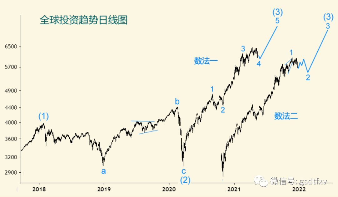 全球投资趋势自2009年3月以来展开循环浪V——(I)浪V最后阶段炒作汽车股,(III)浪III最后阶段炒作科网股,(III)浪V最后阶段炒作加密货币,非常合理及符合事实。在笔者看来,这是唯一数浪方式,其中V浪(1)由2009年3月低位升至2018年初,比特币于2017年底见顶,其他加密货币于2018年初见顶并非偶然。接着是V浪(2),一个不规则平台,其中2018年初跌至年底为(2)浪a,2018年底升至2020年2月为(2)浪b,之后急跌至3月为(2)浪c。2020年3月低点展开V浪(3)。