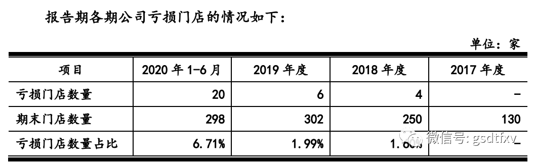 从公司的招股说明书可以得知,2018年至2020年上半年,公司亏损门店数量占比由1.60%增加至6.71%。2019年度期末门店数量为302家,亏损门店6家;2020年上半年,期末门店数量298家,亏损门店20家(见表三)。