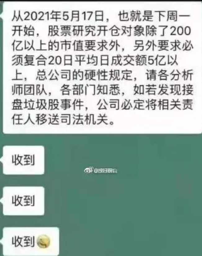 网传消息称,有机构下发通知称:“从2021年5月17日,也就是下周一,股票研究开仓对象除了200亿以上的市值要求外,另外要求必须复合20日平均日成交额5亿以上,总公司的硬性规定,请各分析师团队,各部门知悉,如若发现接盘垃圾股事件,公司必定将相关责任人移送司法机关。”