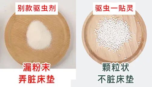 驱虫内料做成了一粒粒 圆形小颗粒 , 防止吸入鼻子或者洒出来 ,比粉末状的更为安全。